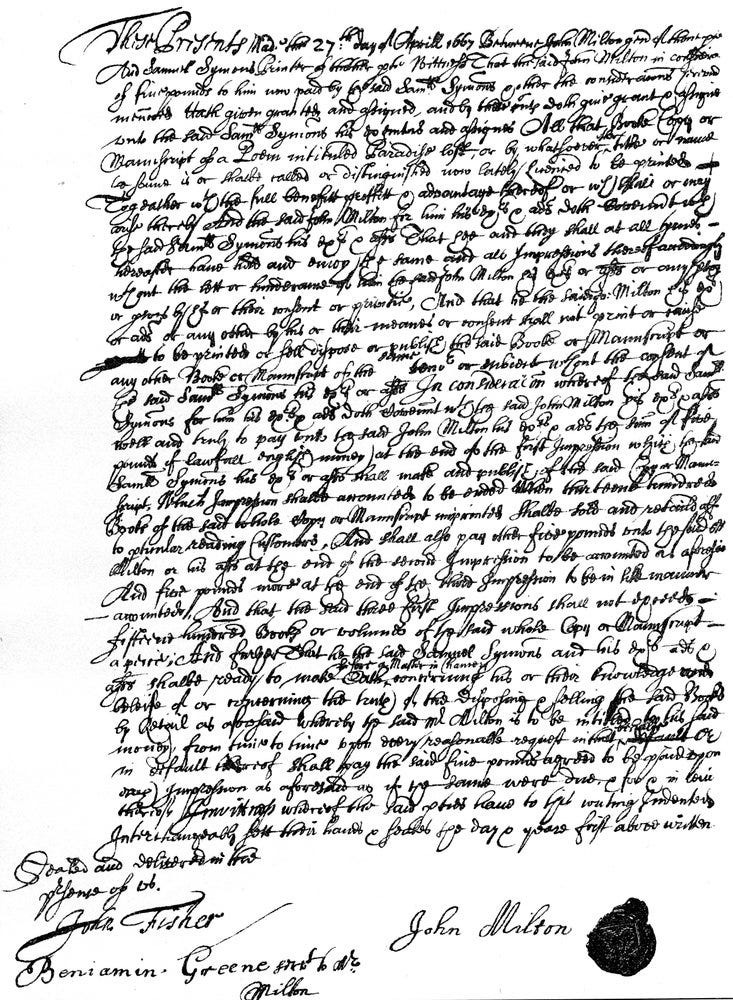 ⁴Milton, who was blind and financially strained at the time, received only £5 upfront, with the promise of another £5 for every 1,300 copies sold, up to a total of £20. The deal shows how little value Paradise Lost was expected to have commercially at first, despite its later fame as one of the greatest works of English literature. The document survives in the British Library and is one of the earliest examples of a formal copyright agreement for a literary work.