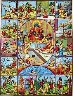 The number and names of hells, as well as the type of sinners sent to a particular hell, vary from text to text; however, many scriptures describe 28 hells. After death, messengers of Yama, called Yamadutas, bring all beings to the court of Yama, where he weighs the virtues and the vices of the being and passes a judgment, sending the virtuous to Svarga (Svarga is often translated as heaven, though it is regarded to be dissimilar to the concept of the Abrahamic Heaven) and the sinners to one of the hells. The stay in Svarga or Naraka is generally described as temporary. After the quantum of punishment is over, the souls are reborn as lower or higher beings as per their merits. (Taken from Wikipedia)