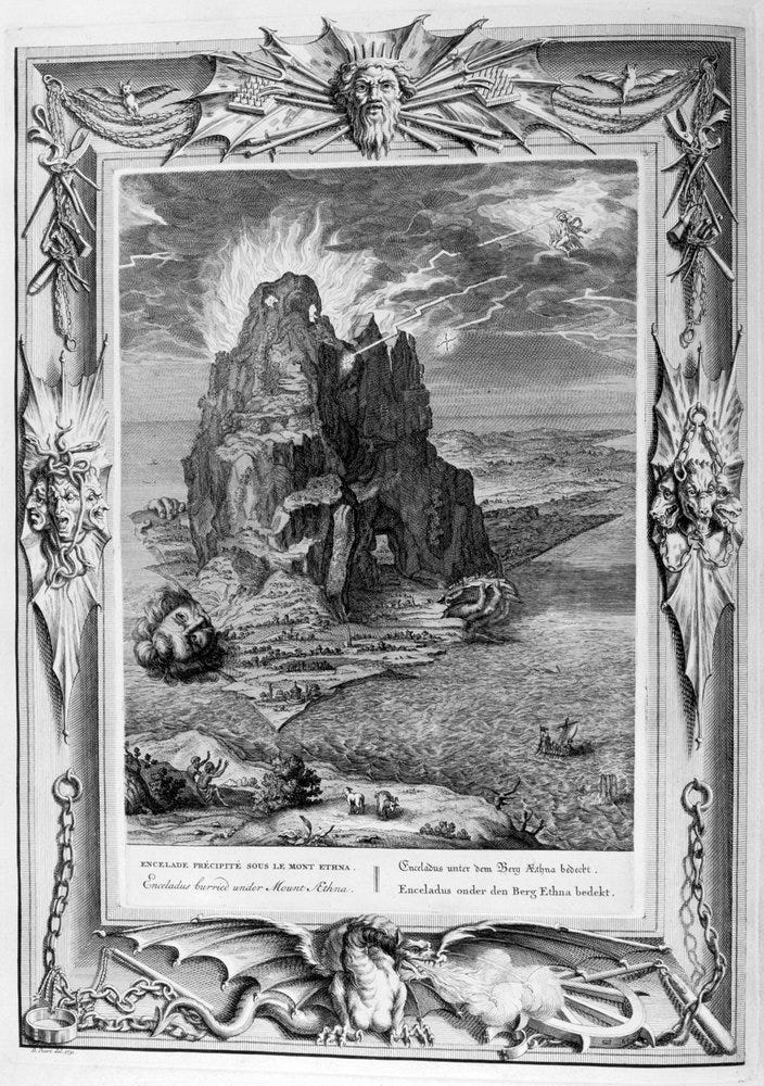 ⁵Etching and engraving by the French artist Bernard Picart or Picard, a French draughtsman, engraver, and book illustrator in Amsterdam, with an interest in cultural and religious habits, part of his series Le Temple des Muses (The Temple of the Muses). The artwork depicts the Greek mythological giant Enceladus being crushed beneath the volcano, with the flames of Etna representing his fiery breath, and quakes from the island of Sicily caused by his movements.