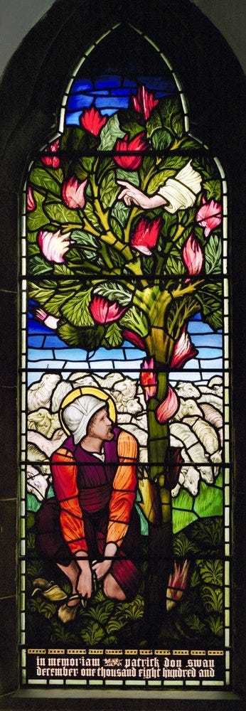 ⁷Burne-Jones stained glass window on the west side of St Brycedale Church of Scotland, St Brycedale Avenue, Kirkcaldy, Fife. St Brycedale Church was built for the Free Church in 1877–9 by James Matthews of Aberdeen. Its spacious interior contains stained glass designed by prominent artists, including Burne-Jones. This stained-glass window shows Moses and the Burning Bush (left) and the Burial of Moses (right). It was designed by Edward Burne-Jones and made by Morris and Company in 1892. Sir Edward Colley Burne-Jones (1833–98) was a member of the Pre-Raphaelite movement, which reacted against Victorian taste by adopting a style influenced by art from before the age of the Italian painter Raphael. Description taken from: